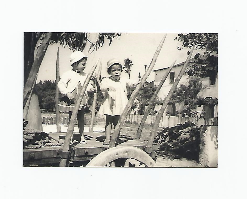Maria da Conceição Azevedo Mendes Mourão em 1948 ou 1949, na varanda da Casa dos seus Avós, nos Soudos, com o Avô Cândido por detrás a segurá-la (não fosse cair de cima da abóbora onde está sentada)
