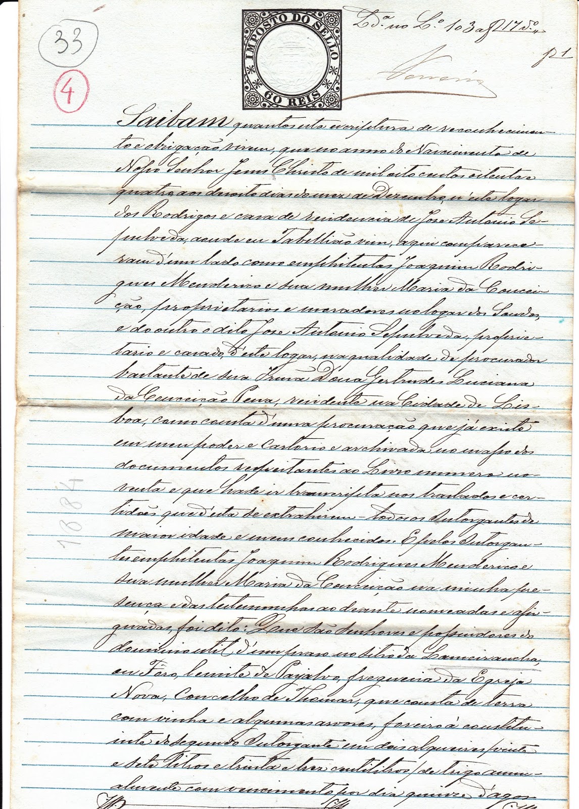 Publica-se a primeira das 4 páginas do dito documento em papel selado da altura